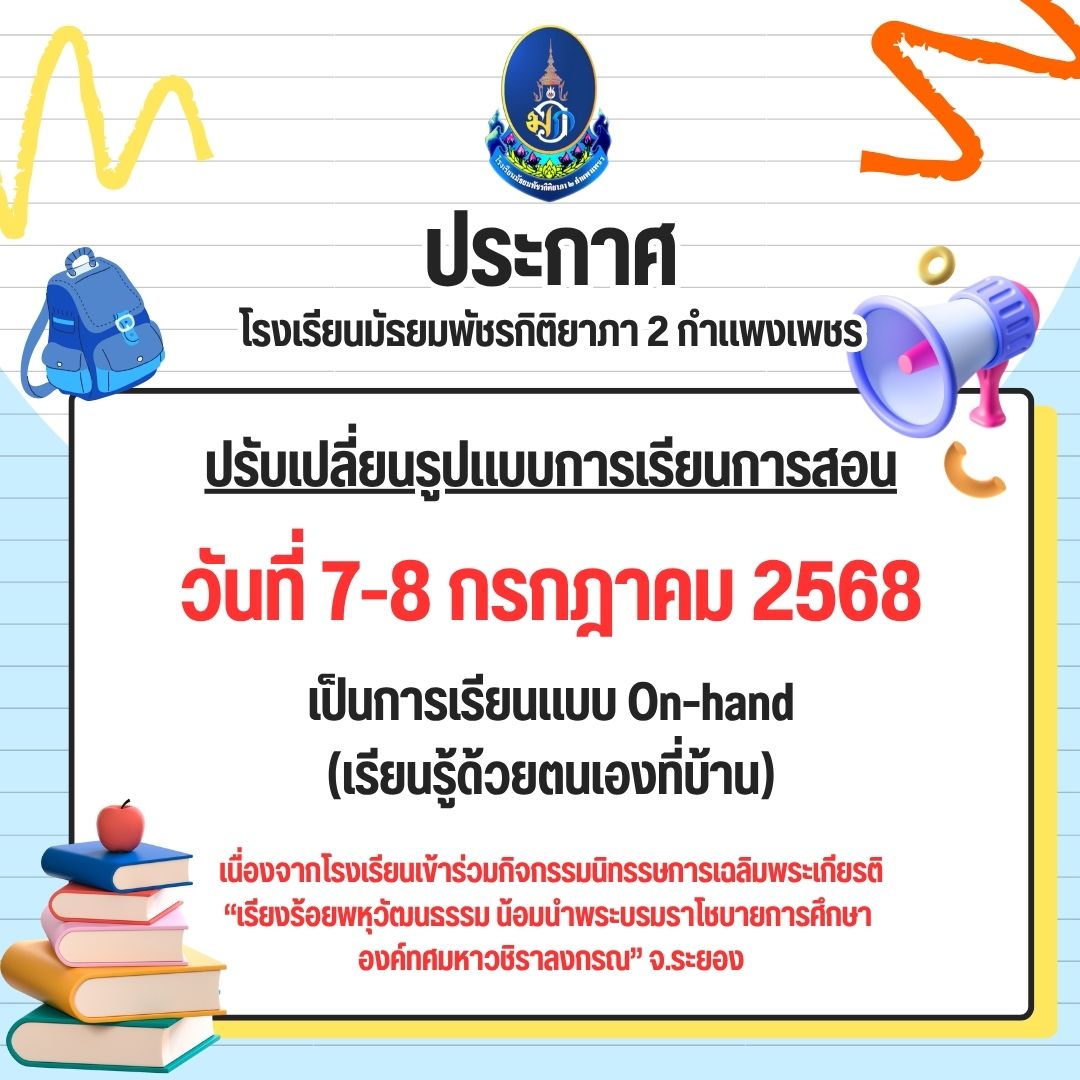 ประกาศสำนักงานเขตพื้นที่การศึกษามัธยมศึกษากำแพงเพชร ????เรื่อง รายชื่อโรงเรียนในสังกัดสำนักงานเขตพื้นที่การศึกษามัธยมศึกษากำแพงเพชรและสถานศึกษาสังกัดหน่วยงานอื่น ที่มีรายชื่อนักเรียนไม่เต็มแผนการรับนักเรียน 12 เม.ย. 68