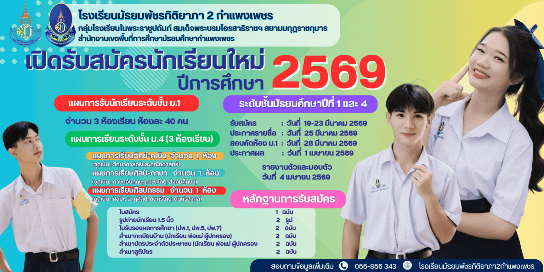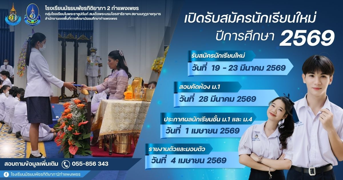 ประกาศโรงเรียนมัธยมพัชรกิติยาภา ๒ กำแพงเพชร เรื่อง การรับสมัครนักเรียนเขEาเรียนชั้นมัธยมศึกษาปIที่ 1 และชั้นมัธยมศึกษาปIที่ 4 23 ก.พ. 68