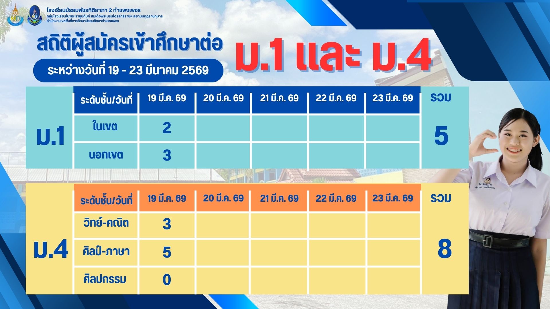 ประกาศสำนักงานเขตพื้นที่การศึกษามัธยมศึกษากำแพงเพชร ????เรื่อง รายชื่อโรงเรียนในสังกัดสำนักงานเขตพื้นที่การศึกษามัธยมศึกษากำแพงเพชรและสถานศึกษาสังกัดหน่วยงานอื่น ที่มีรายชื่อนักเรียนไม่เต็มแผนการรับนักเรียน 12 เม.ย. 68